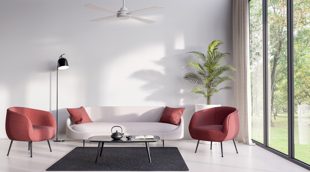 Monochromatic, modern greyscale living room with two five-blade ceiling fans