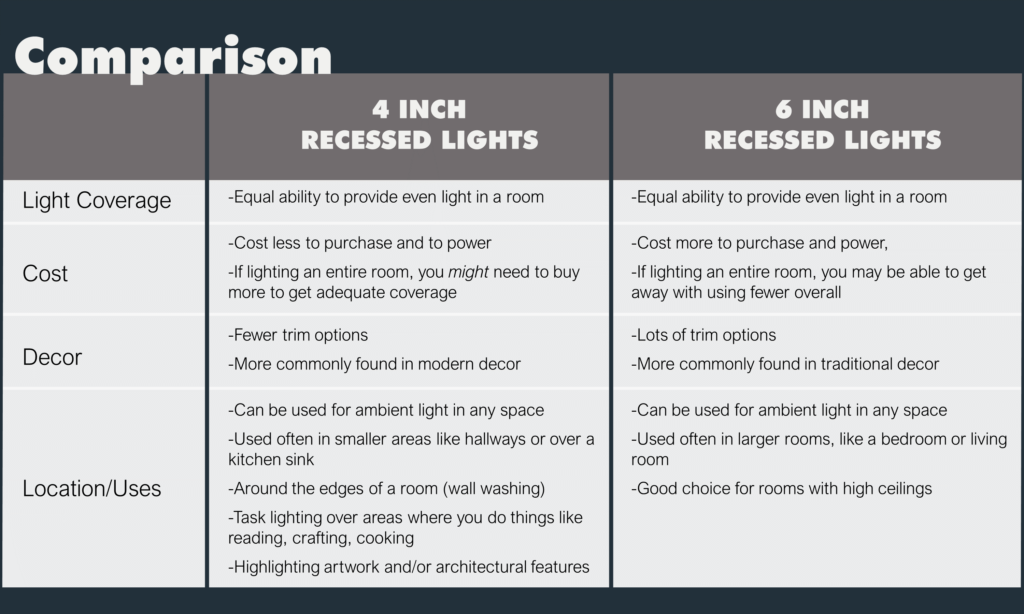 To sum it all up, here’s a handy comparison between 4” and 6” recessed lights.