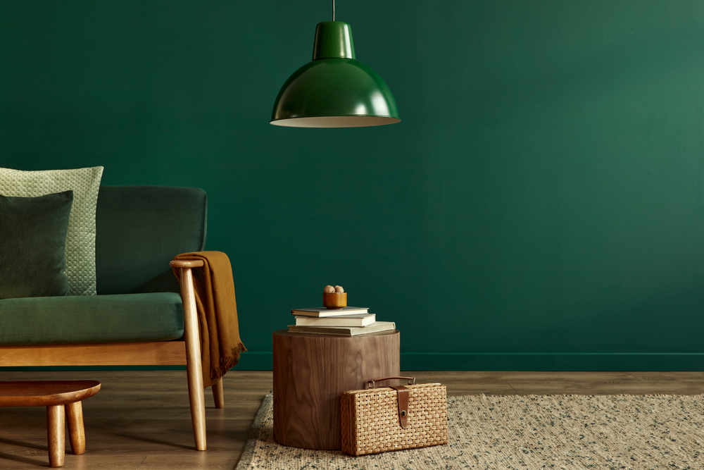 A green pendant lamp with a green wall and green furniture might seem like a lot, but it works. Having various shades of the same color adds a fun pop of personality.
